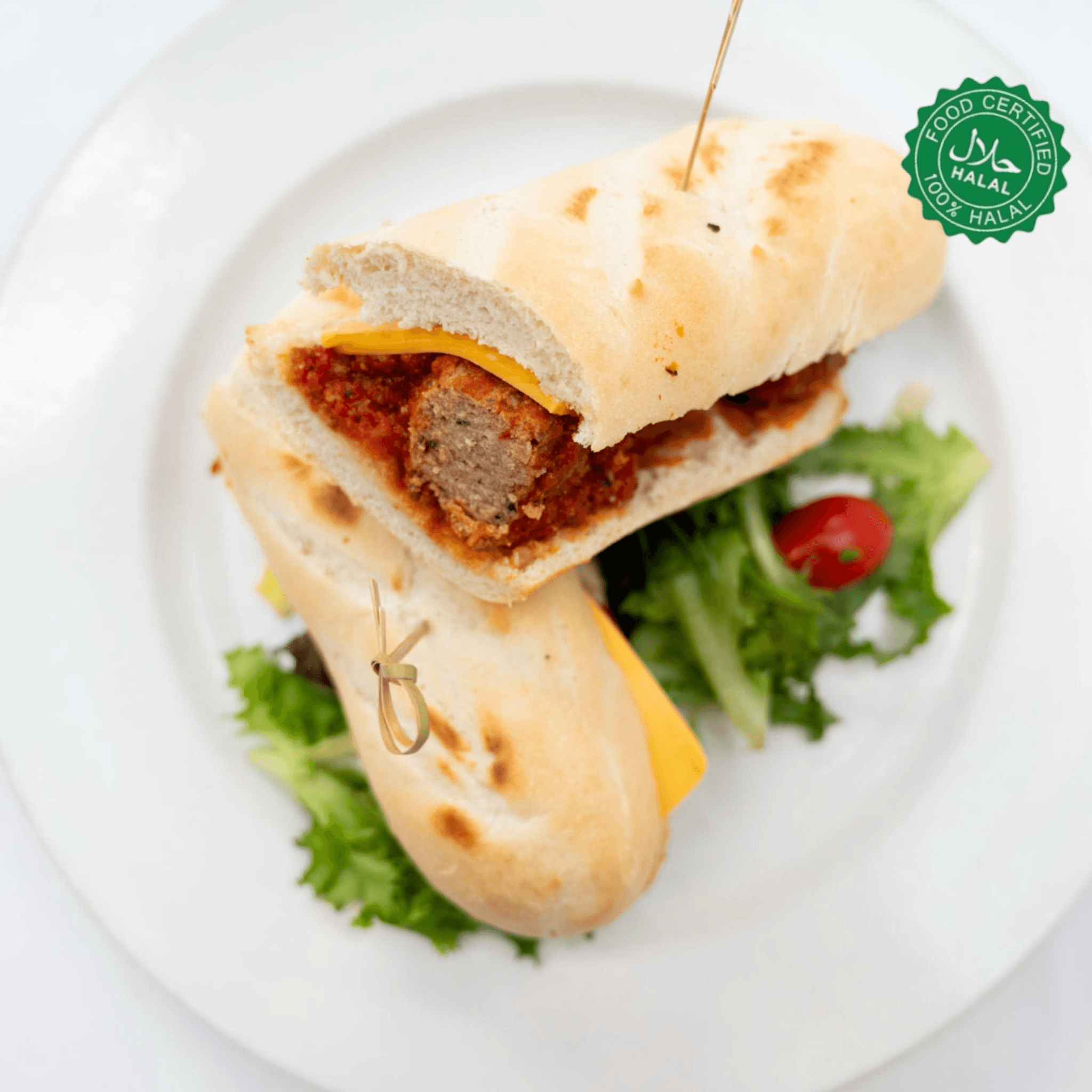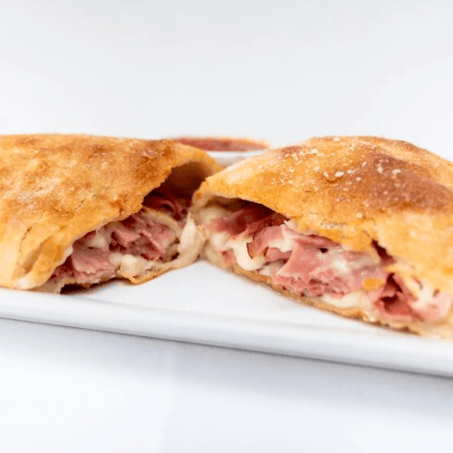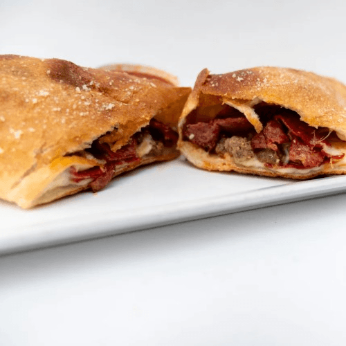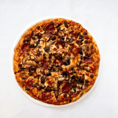 Beef pepperoni, beef sausage, beef meatball and turkey ham with mozzarella cheese and marinara sauce