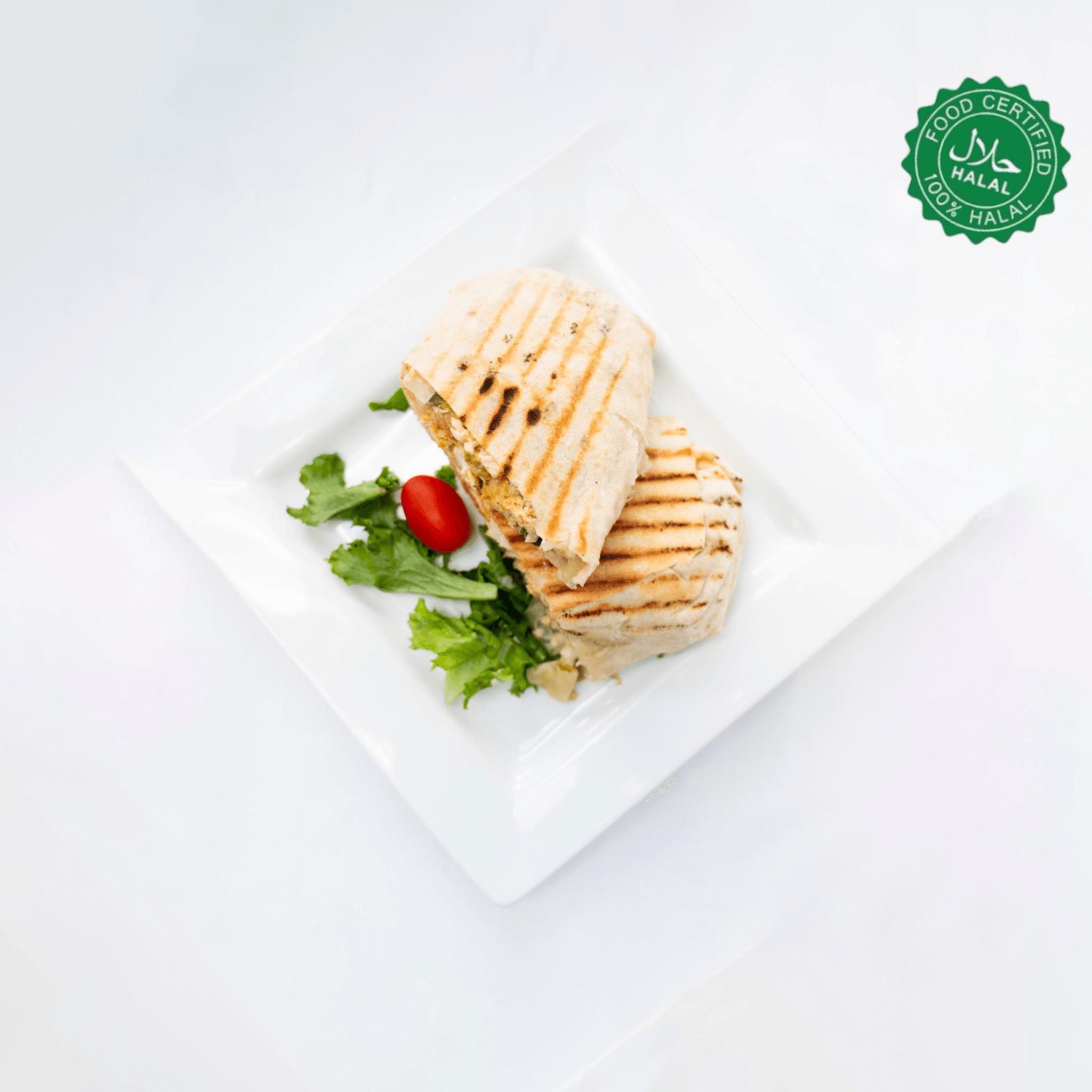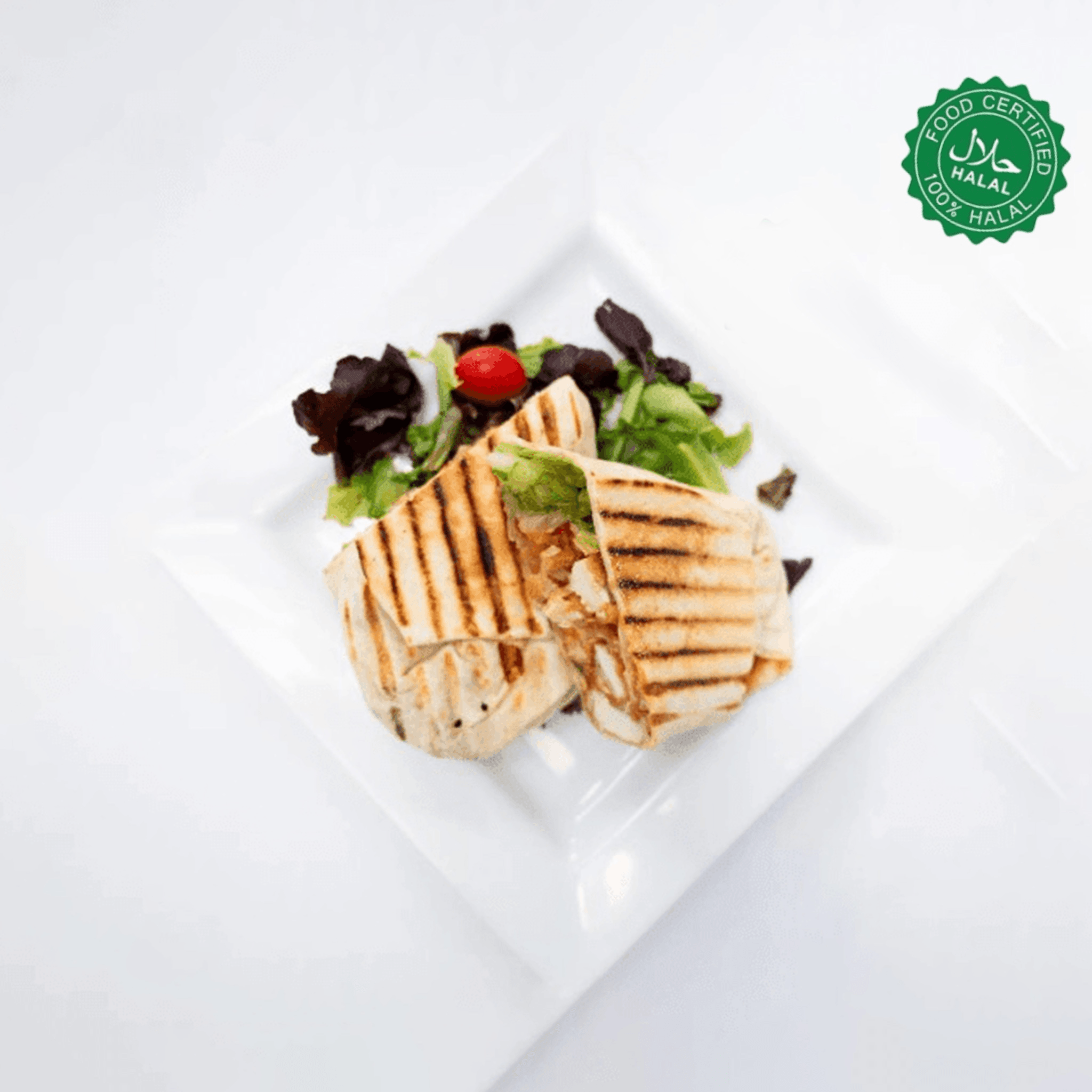 Fried chicken breast, lettuce, tomatoes, and sweet & sour sauce wrapped in a flour tortilla. (Halal)