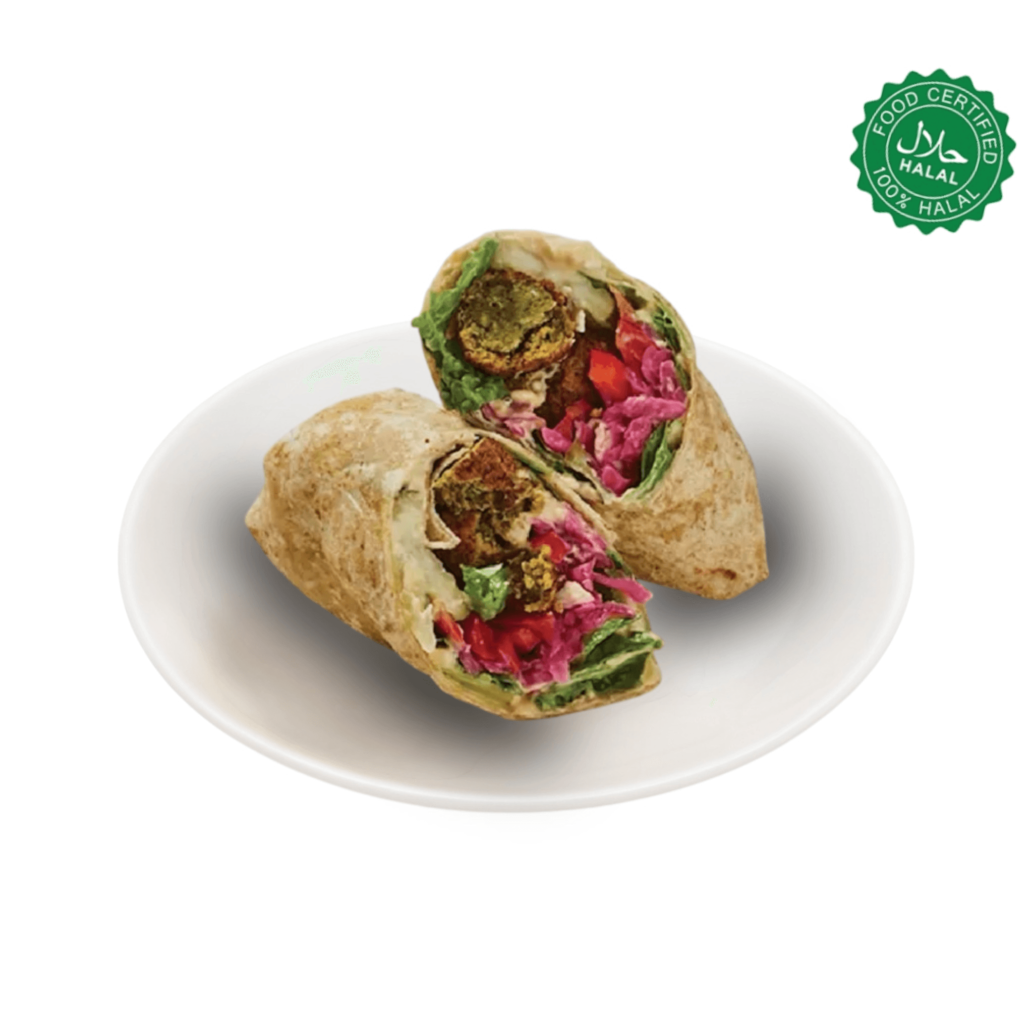 Falafel, lettuce, tomatoes, tahini and ranch sauce (Halal).