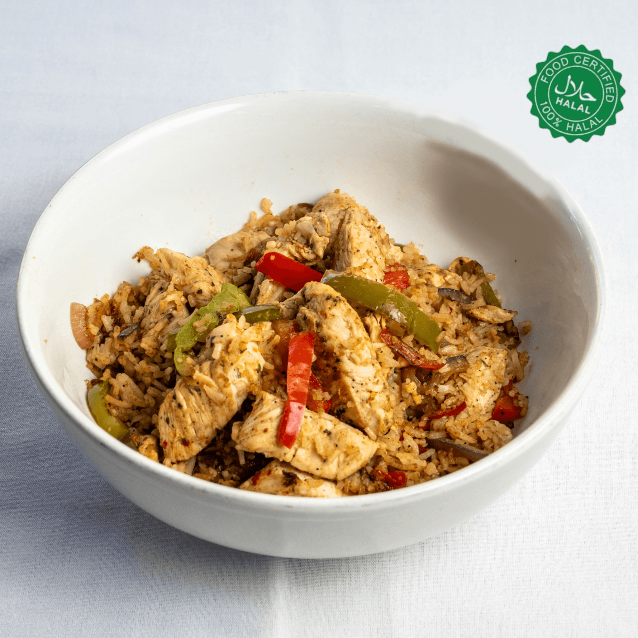 Grilled chicken, white basmati rice, peppers, onions, mushrooms and broccoli topped with ranch (Halal)