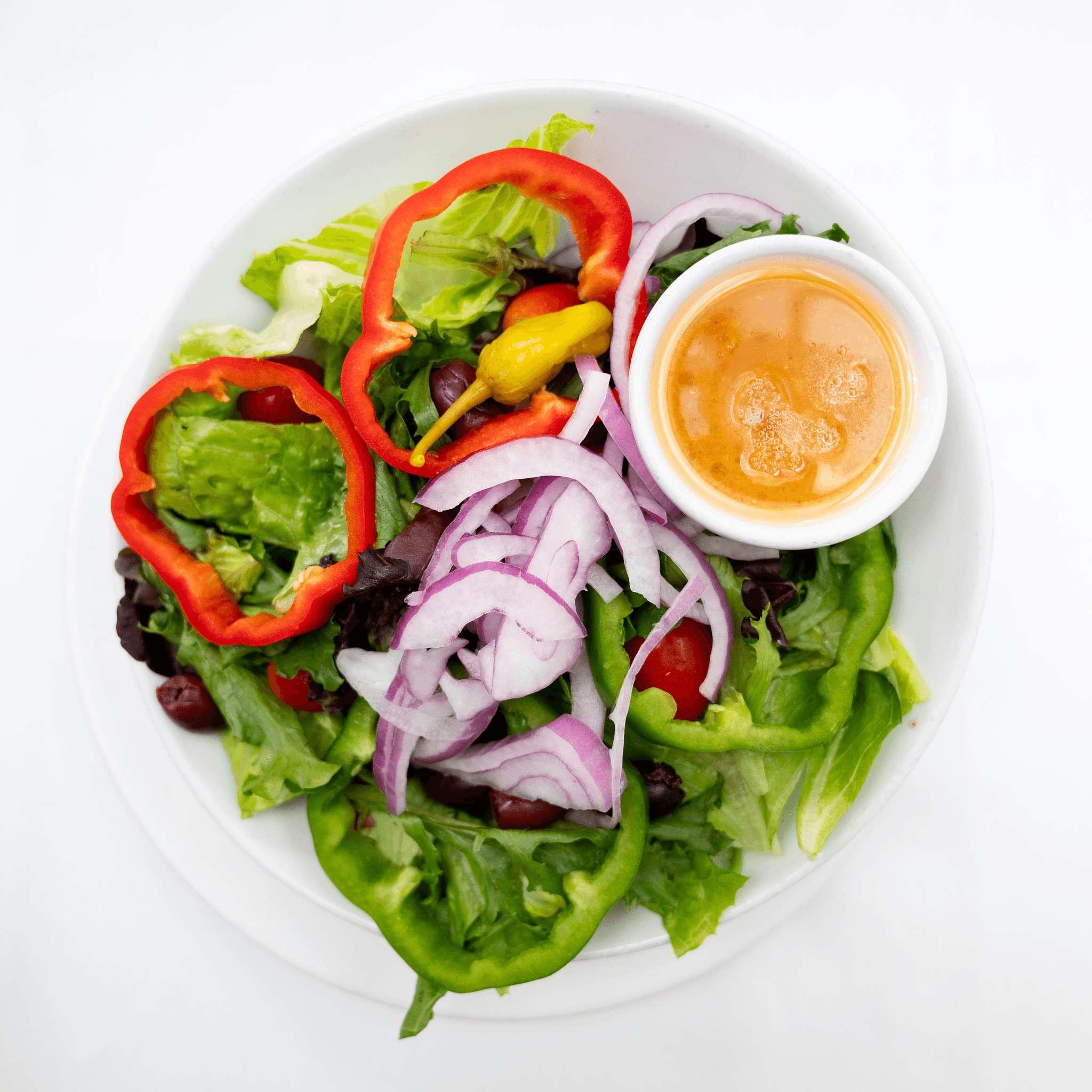 Romaine lettuce, English seedless cucumbers, tomatoes, red onion, green & red peppers, oil & vinegar, salt & pepper
