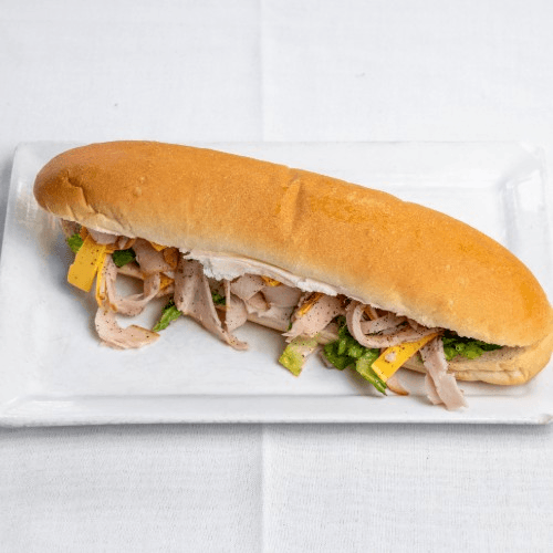 Smoked turkey, provolone cheese, mayo, lettuce, red onion, tomato, hot relish, and pickles