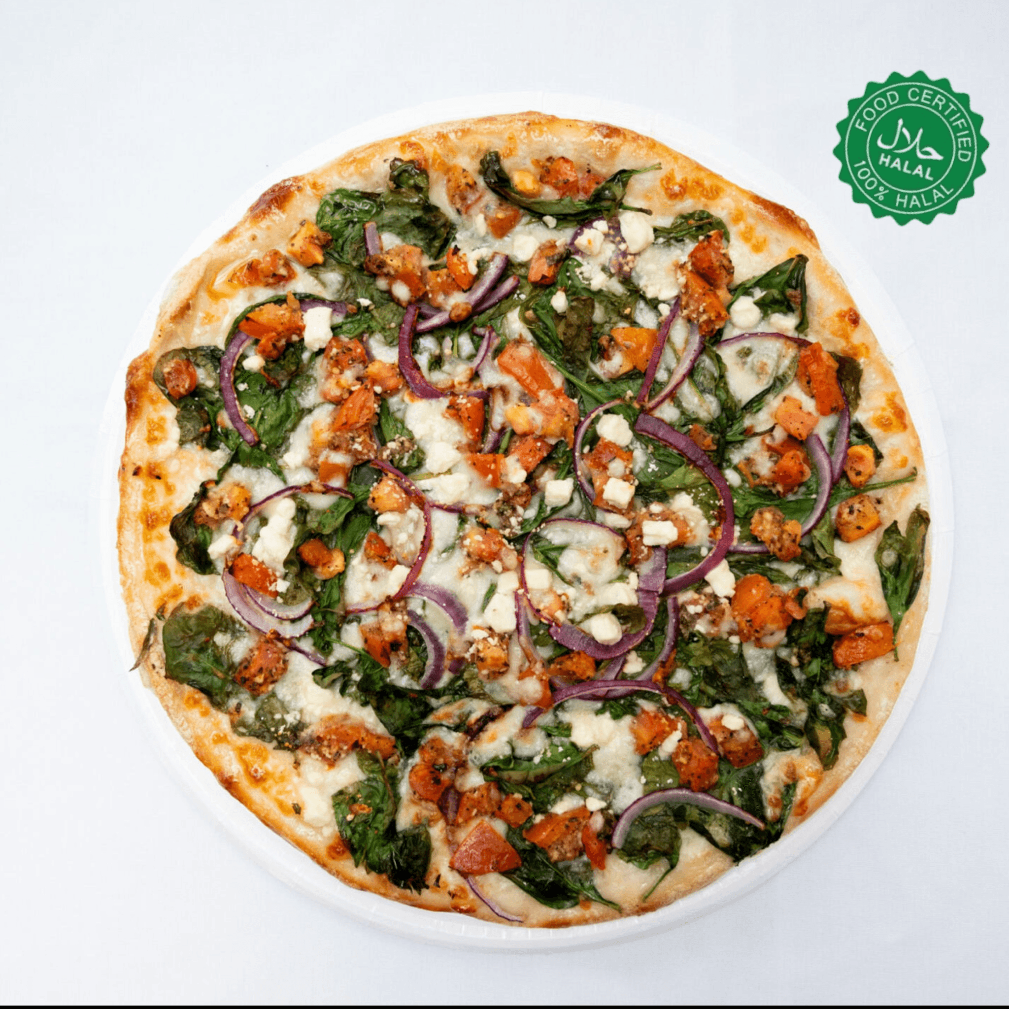 Tomato, onion, spinach, feta and mozzarella. No sauce (Halal)