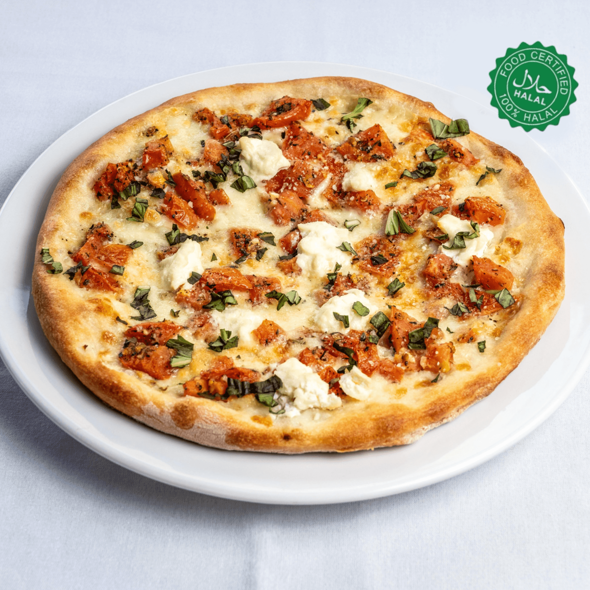 Diced tomatoes, ricotta, fresh mozzarella and cheese, no sauce (Halal)