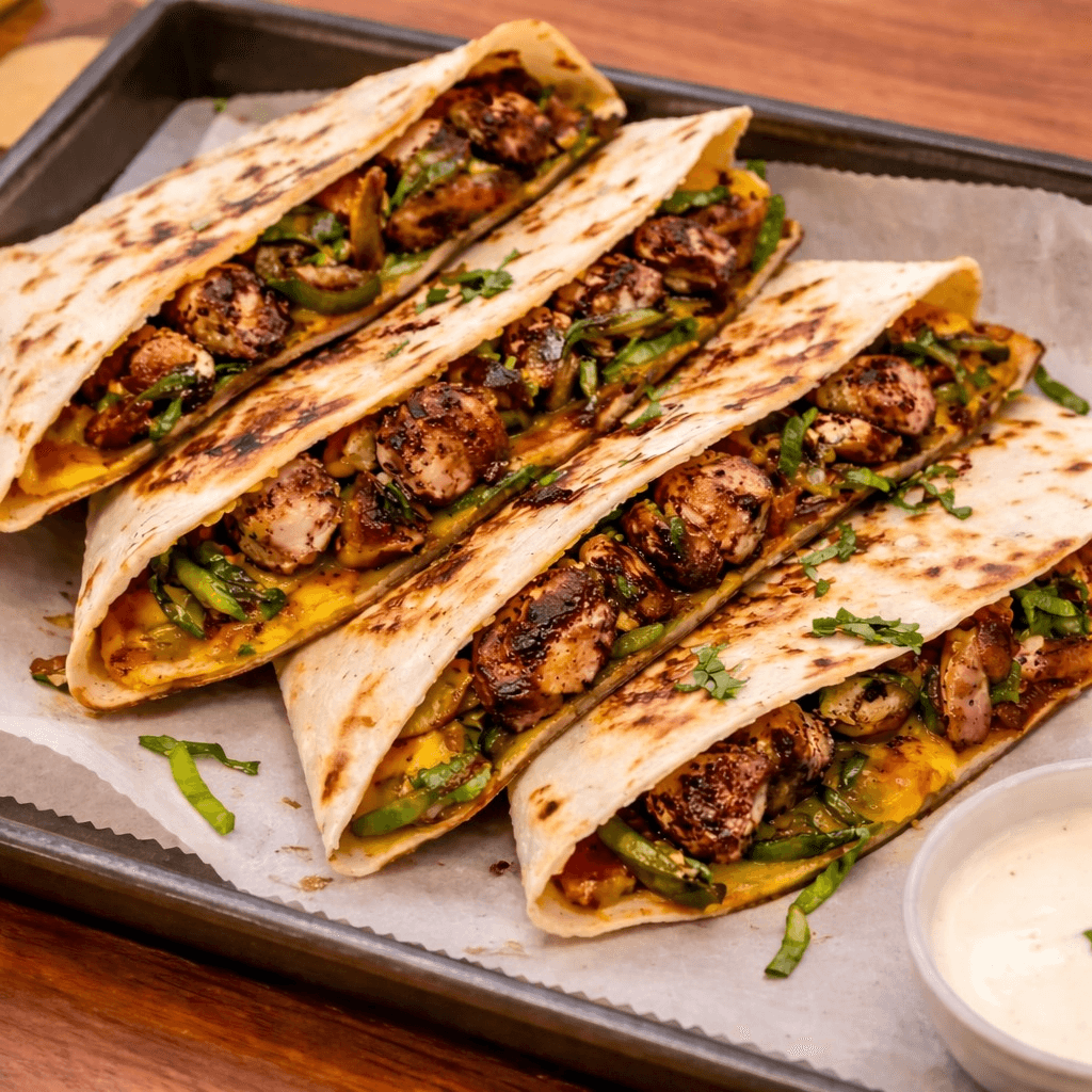 Marinated Chicken , onions, peppers, and tri-blend cheese