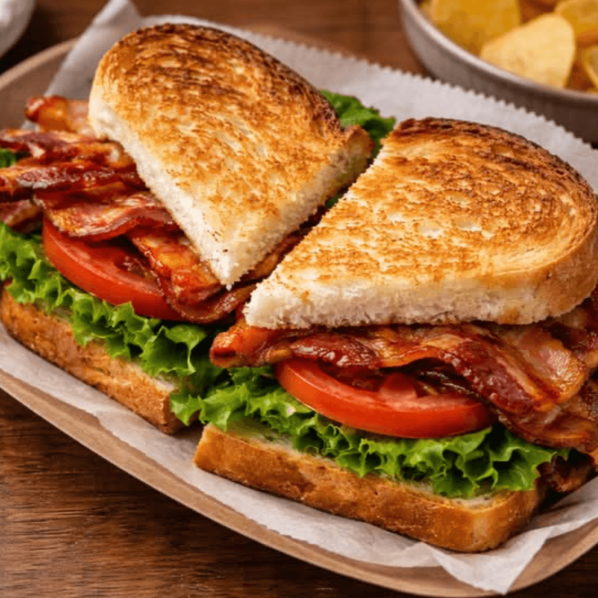 Smoked bacon, lettuce, tomato, mayo on toasted white bread