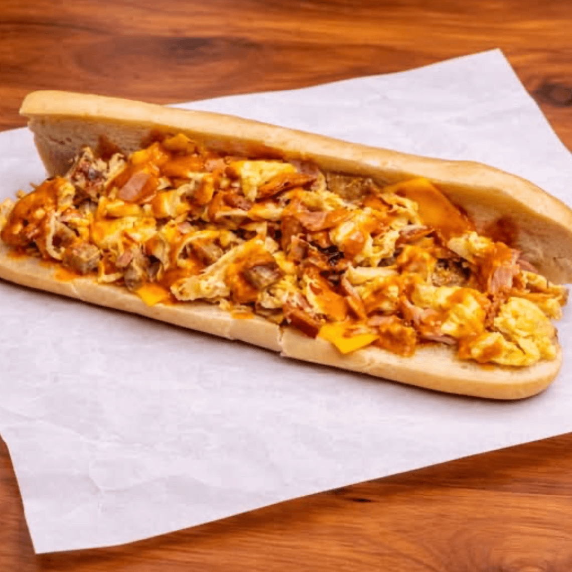 3 eggs, bacon, sausage, ham, and cheese on a toasted sub roll