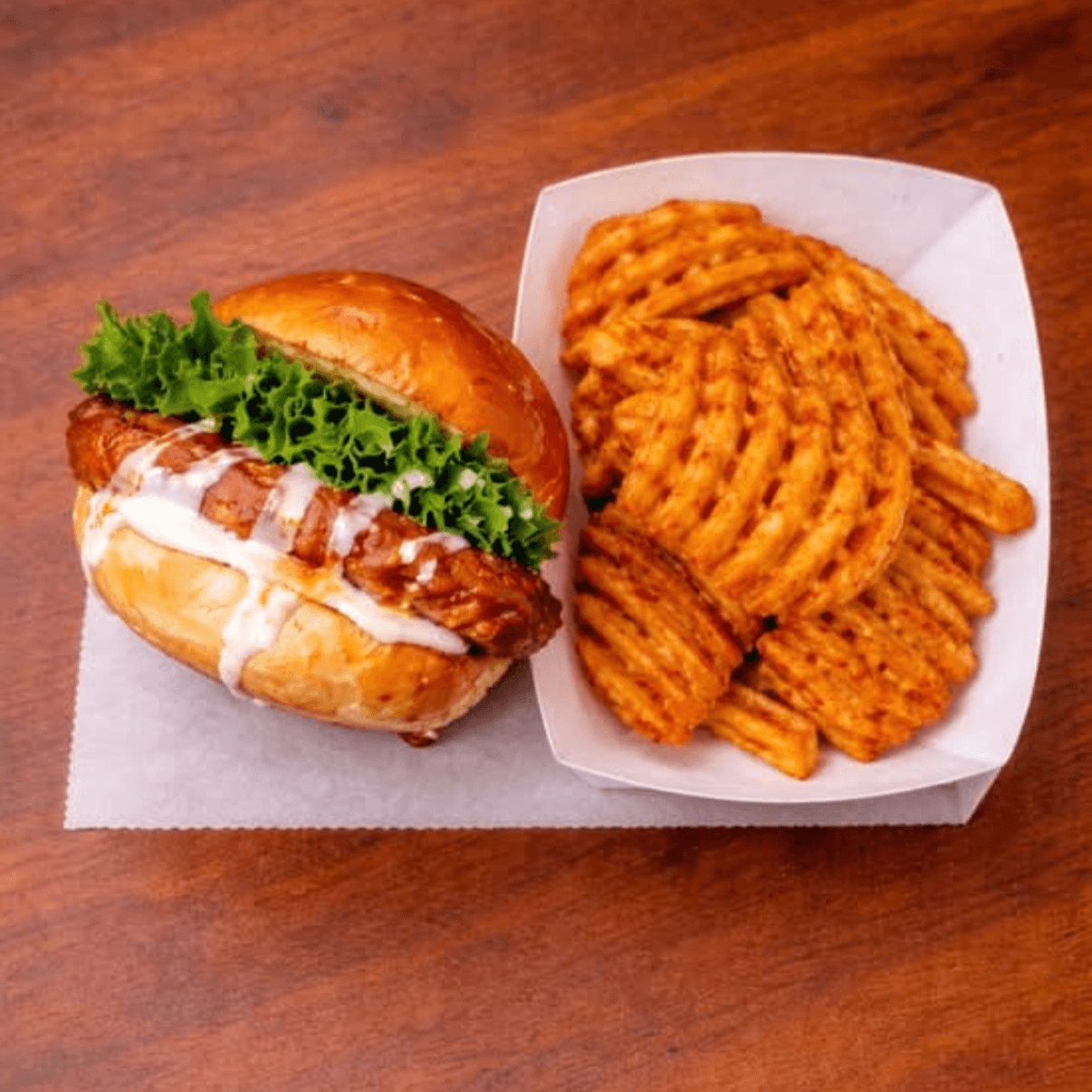 American cheese, Burger Sauce, Lettuce, Tomato, Onions, Pickles. Served with fries