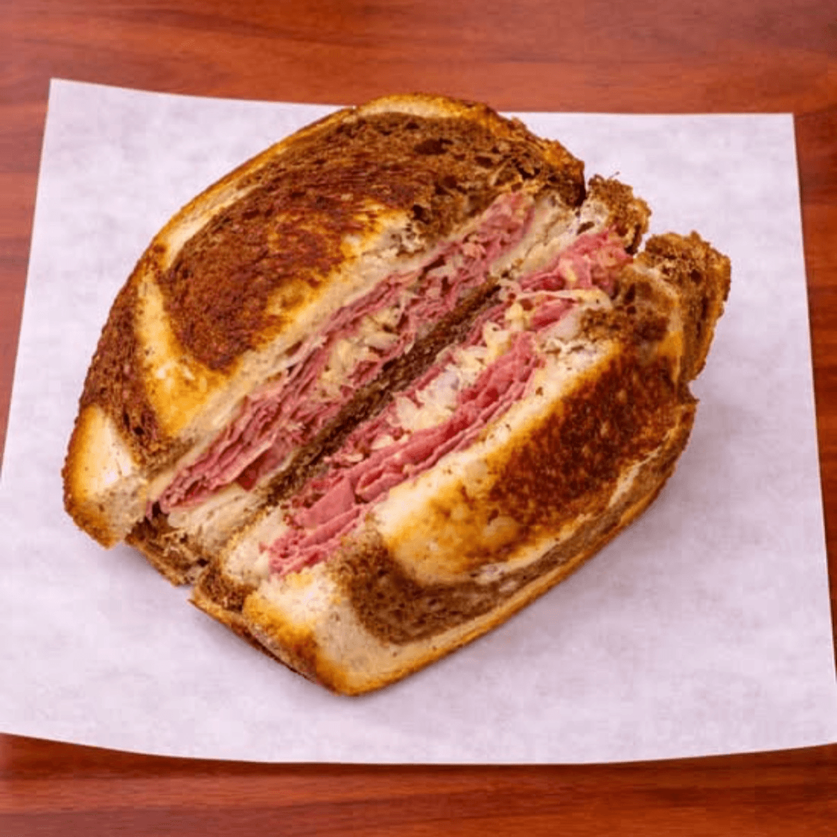 Corned beef, sauerkraut, swiss cheese, russian dressing, on marble rye