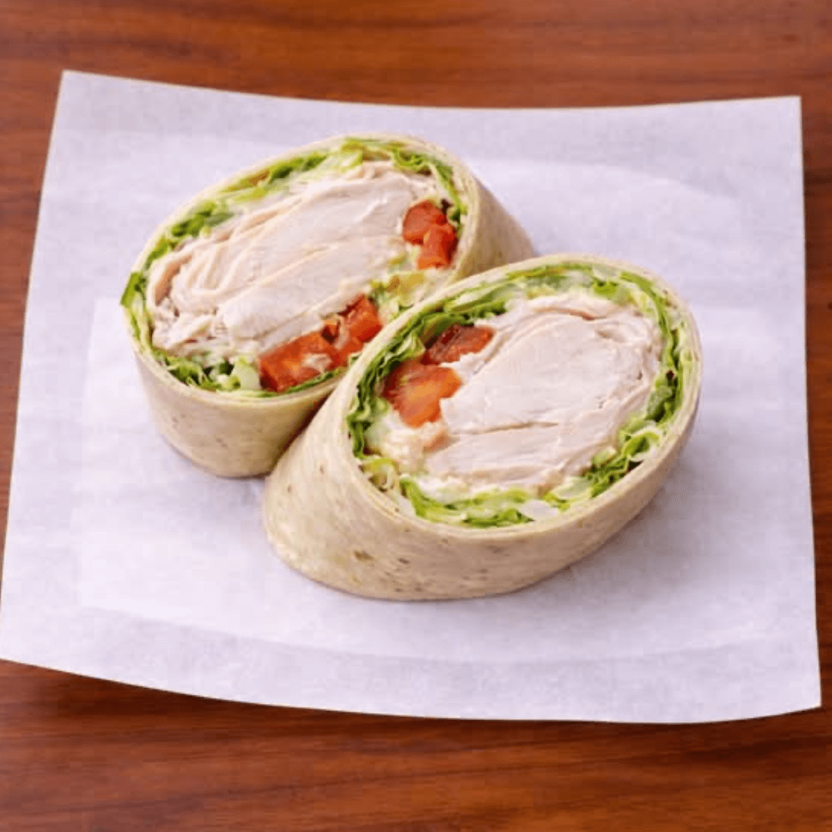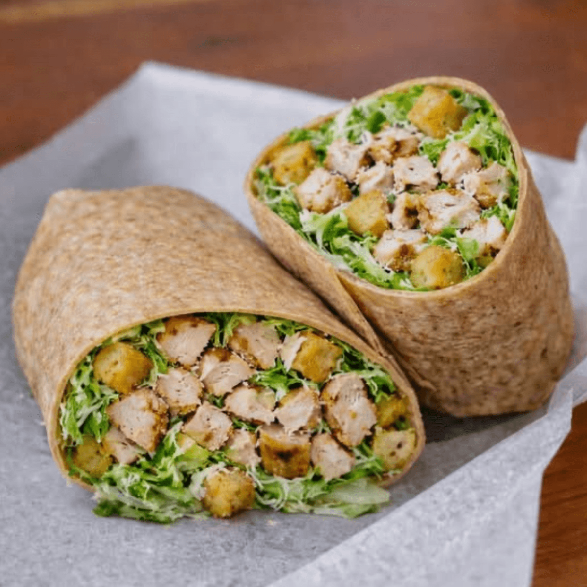10 Grilled Chicken Caesar Wraps. Grilled Chicken, Lettuce, Parmesan Cheese, Croutons, and Caesar Dressing. Served on Flour Tortilla.