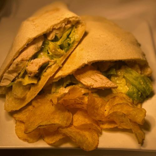 fresh-baked pocket filled with roasted chicken breast, crisp romaine lettuce, creamy Caesar dressing
