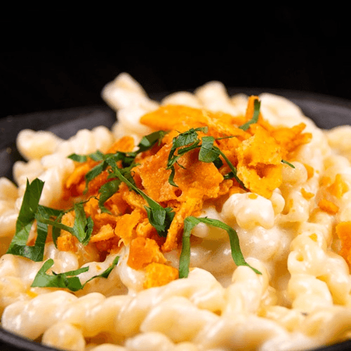 gemelli pasta tossed in a velvety three cheese blend, topped with cheez-it crumble