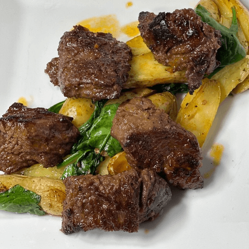 flame-seared house-marinated steak tips, served with roasted fingerling potatoes & sautéed spinach (flamed seared in pizza oven, served medium-well to well done, no choice of temp)