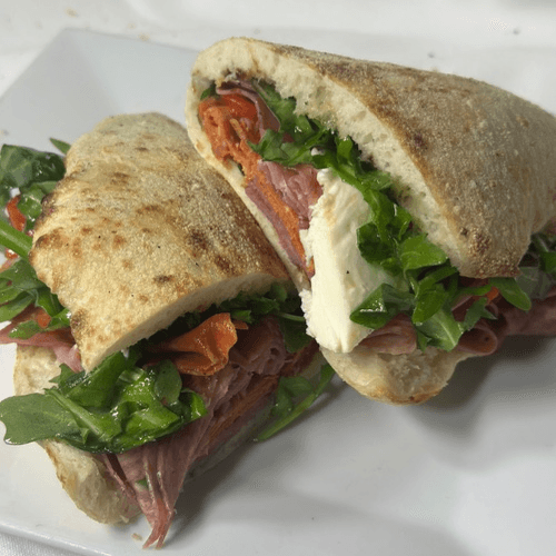 fresh baked pocket filled with sweet capicola, salami, prosciutto, pepperoni, fresh mozzarella, arugula, roasted red peppers, olive oil, balsamic glaze, salt & pepper