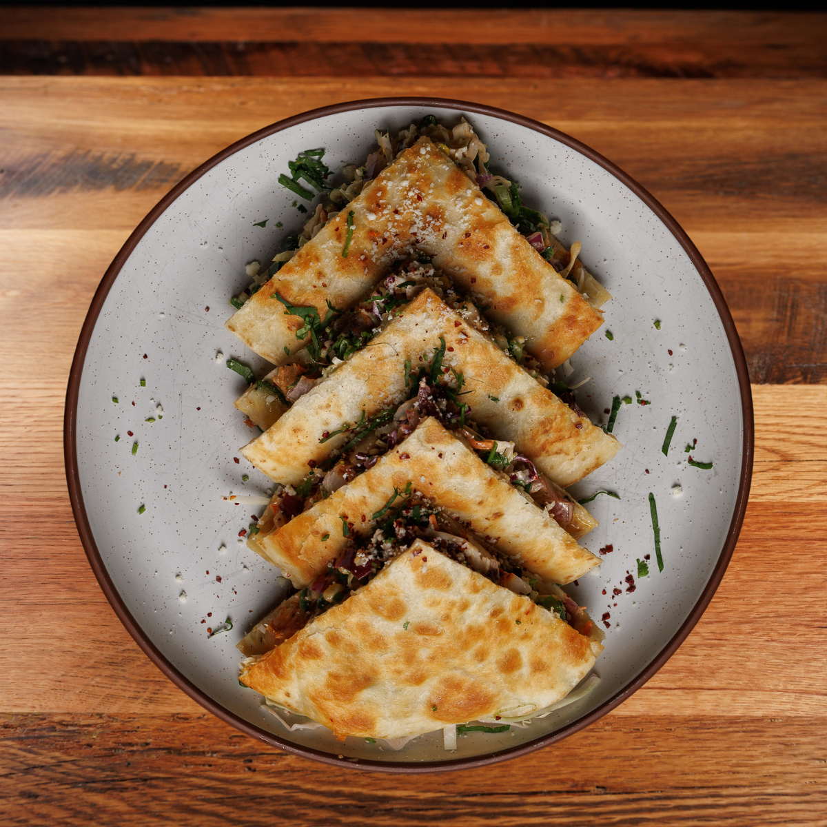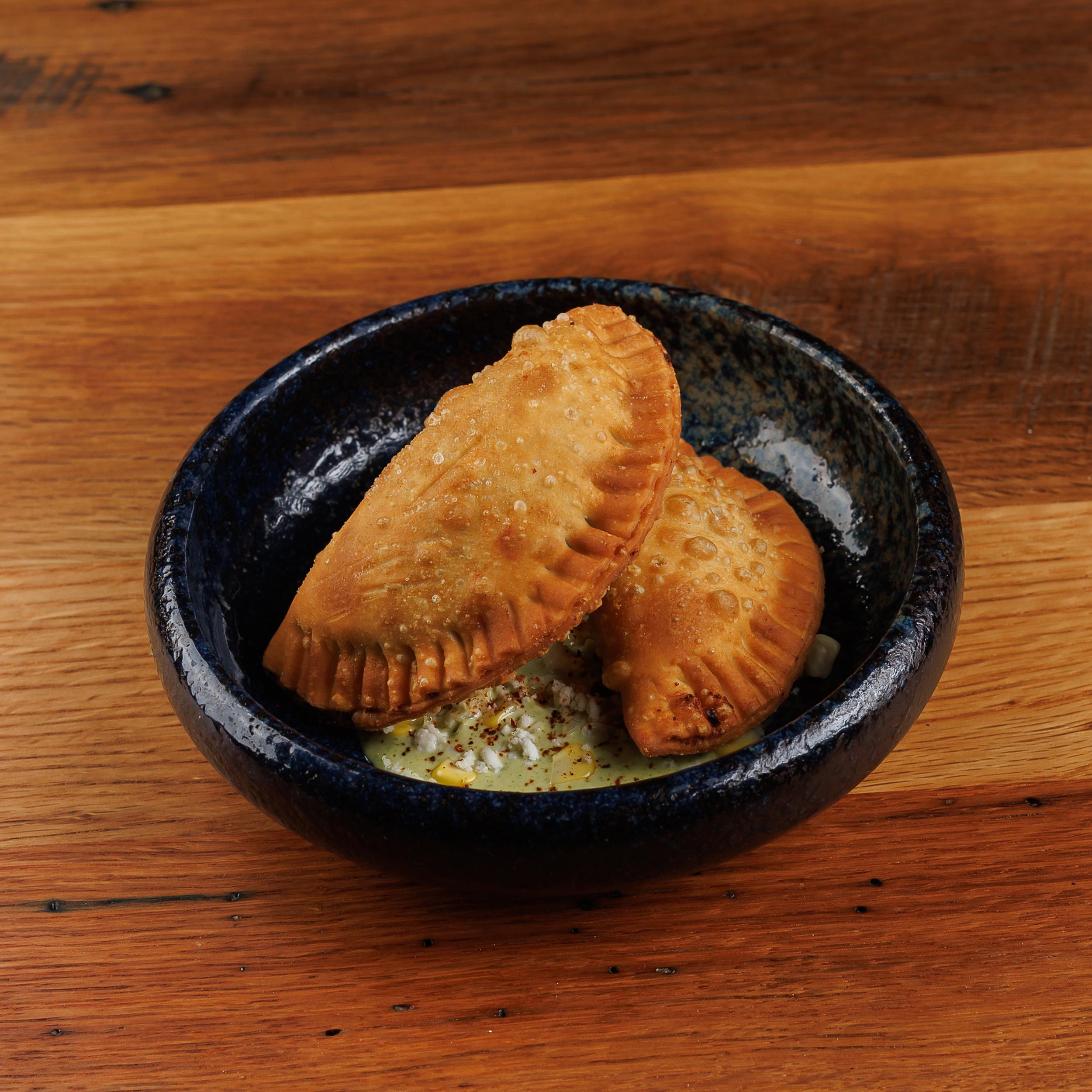 Green chili chorizo, puff pastry, mustard especial, pickled peppers, sesame House made chorizo- pork butt marinated in ancho chilis, roasted poblanos, garlic, onion, salt and cinnamon, is ground fresh and rolled in puff pastry. The pastry is brushed with egg wash and sprinkled with sea salt and sesame seeds before being baked fresh daily. They are gently reheated to order and served with pickled banana peppers and mustard especial. 4 per order, garnished with scallion, Aleppo and cotija che