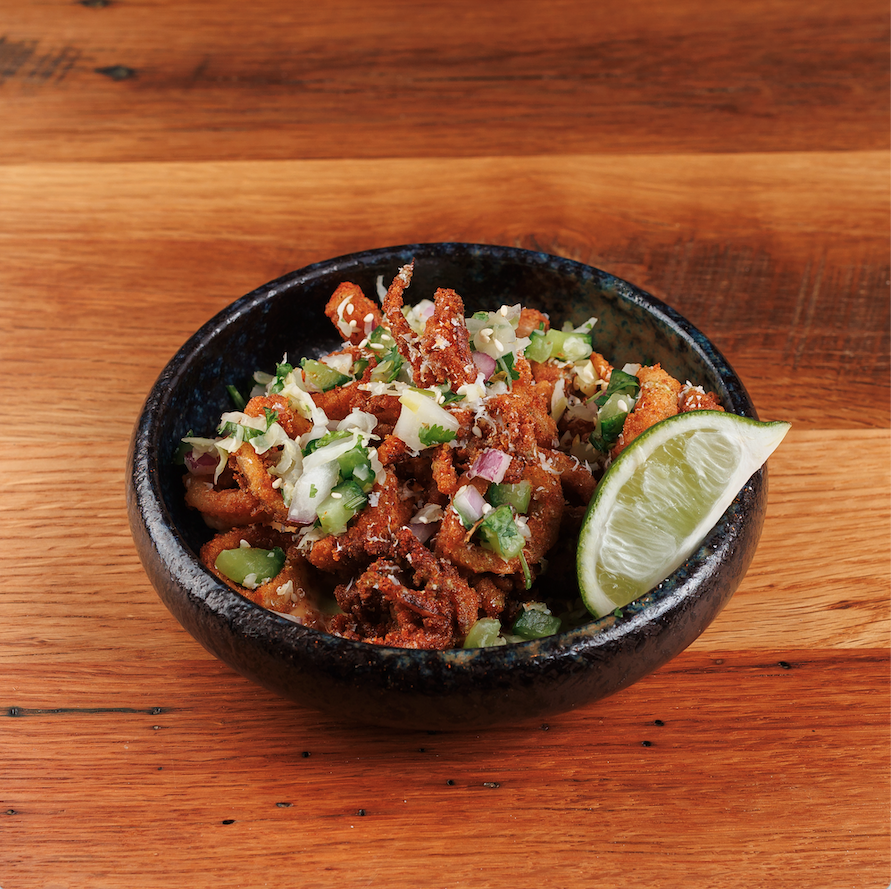 Rhode Island calamari, red chili dynamite, cilantro mojo, red onion, quest cotija, sesame-cabbage pico