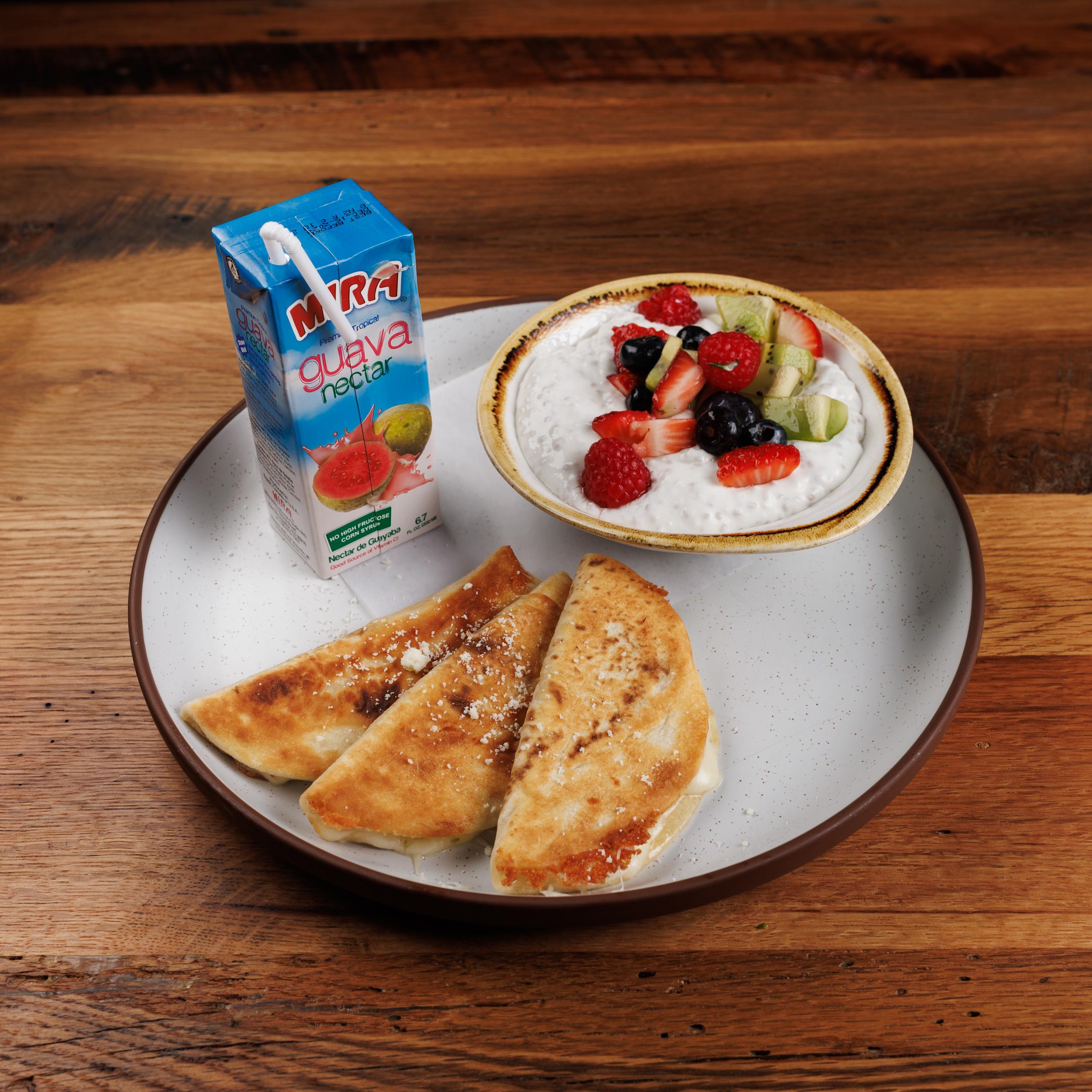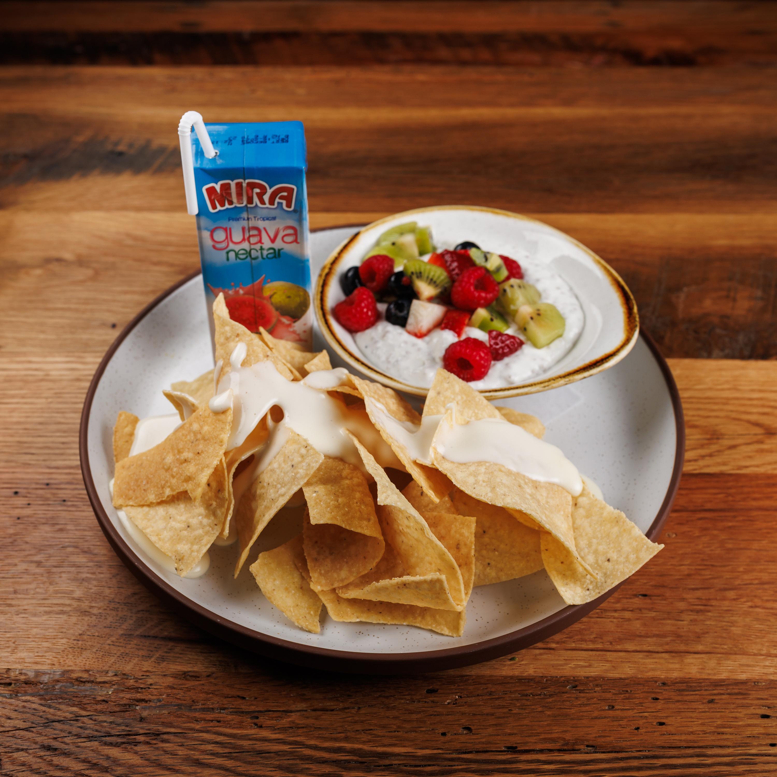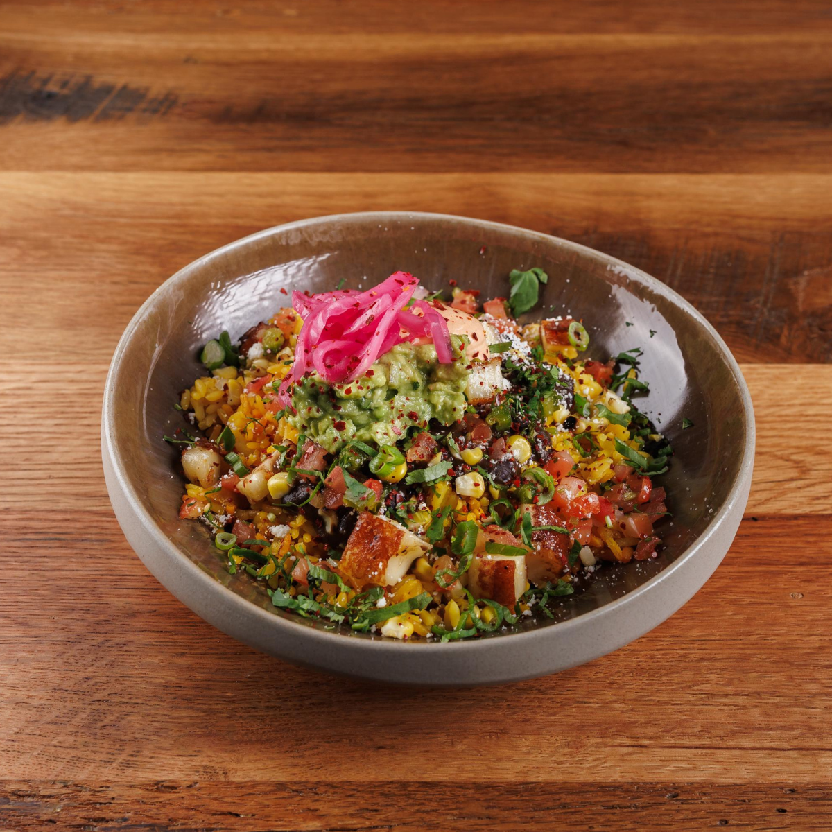 sofrito rice & black beans, queso asadero, garlic corn, chipotle crema, guacamole, pickled red onion