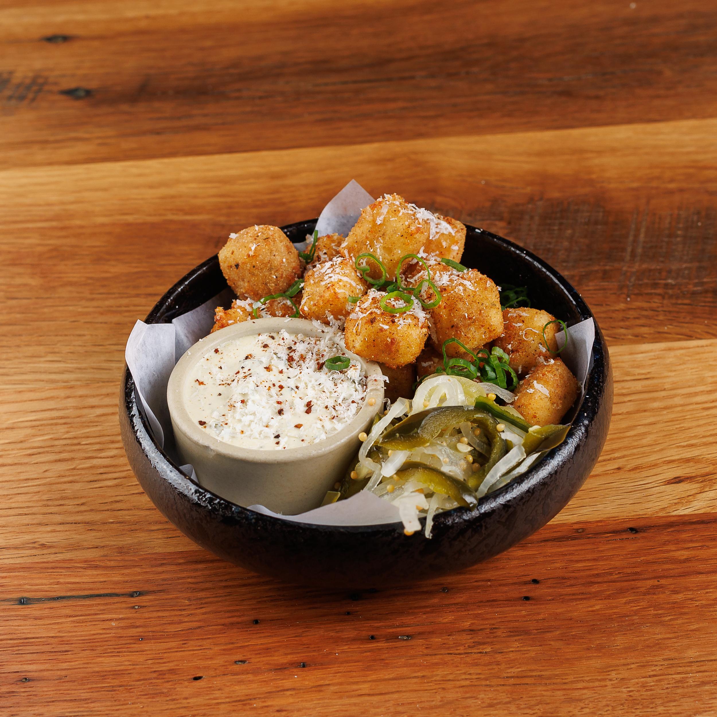 Masa fritters, yucateco onion dip, charred serrano, queso cotija Cauliflower fritters are made with raw, grated cauliflower, egg, oaxaca cheese, cilantro, and masa flour. Seven per order, fried until crispy and topped with a yucateco onion sauce, garlic and onion are sweated in yucateca red hot sauce and blended with sour cream. The fritters are garnished with roasted, diced serranos, cilantro, chipotle morita flake and chipotle oil. Allergies: Dairy, Egg, Gluten (cross in fryer), shellf