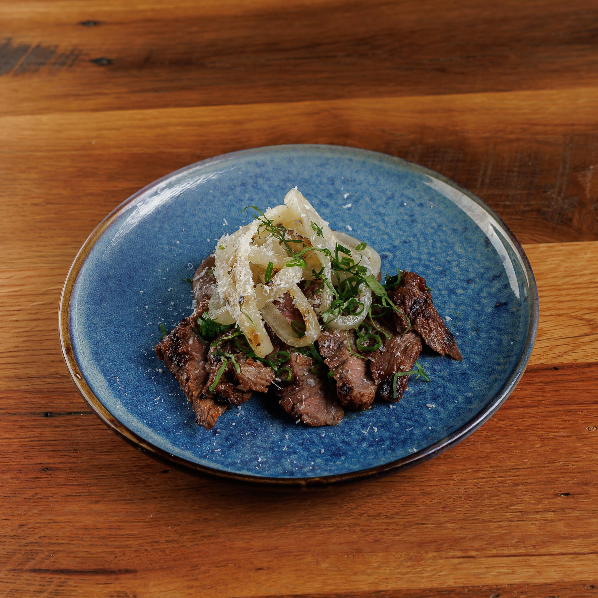 grilled niman ranch bavette, red chili adobo, grilled onions, black bean refrito, queso cotija