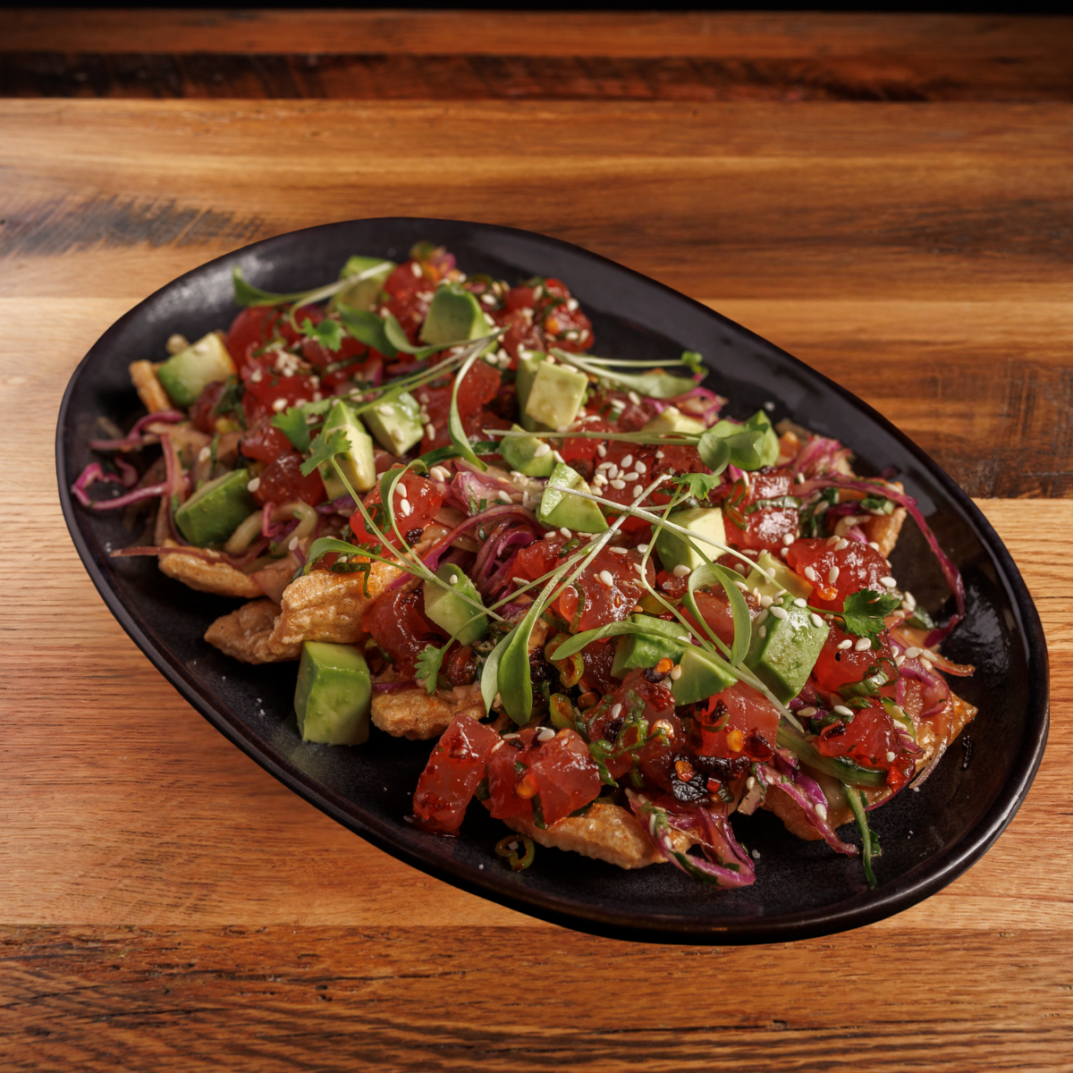 red chili tuna, avocado, sesame slaw, crispy chili mayo, wheat puff cracker