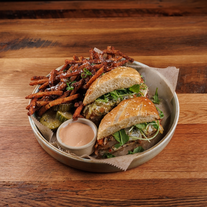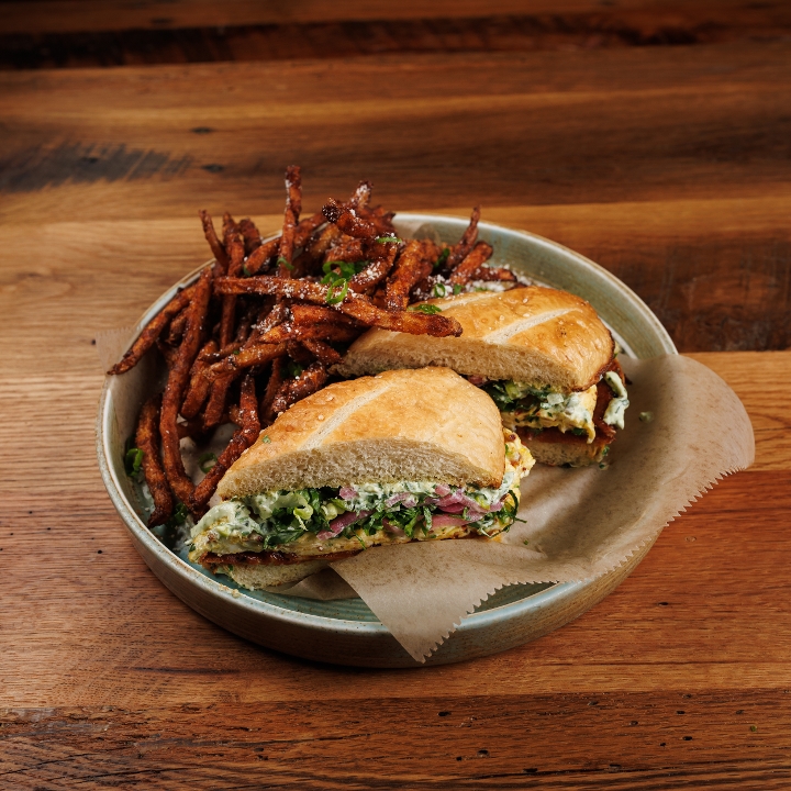 chipotle scrambled eggs, bean refrito, grilled queso, green goddess, sesame torta bun