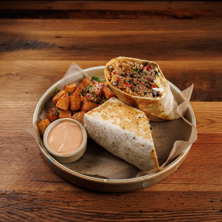 ribeye steak, scrambled eggs, queso, spicy rice & beans, home fries