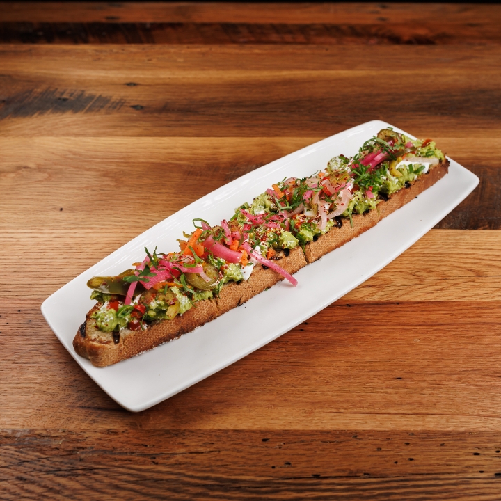 crushed avocado, crumbled cotija, crema, sea salt, lime, hot sauce, grilled whole wheat garlic toast