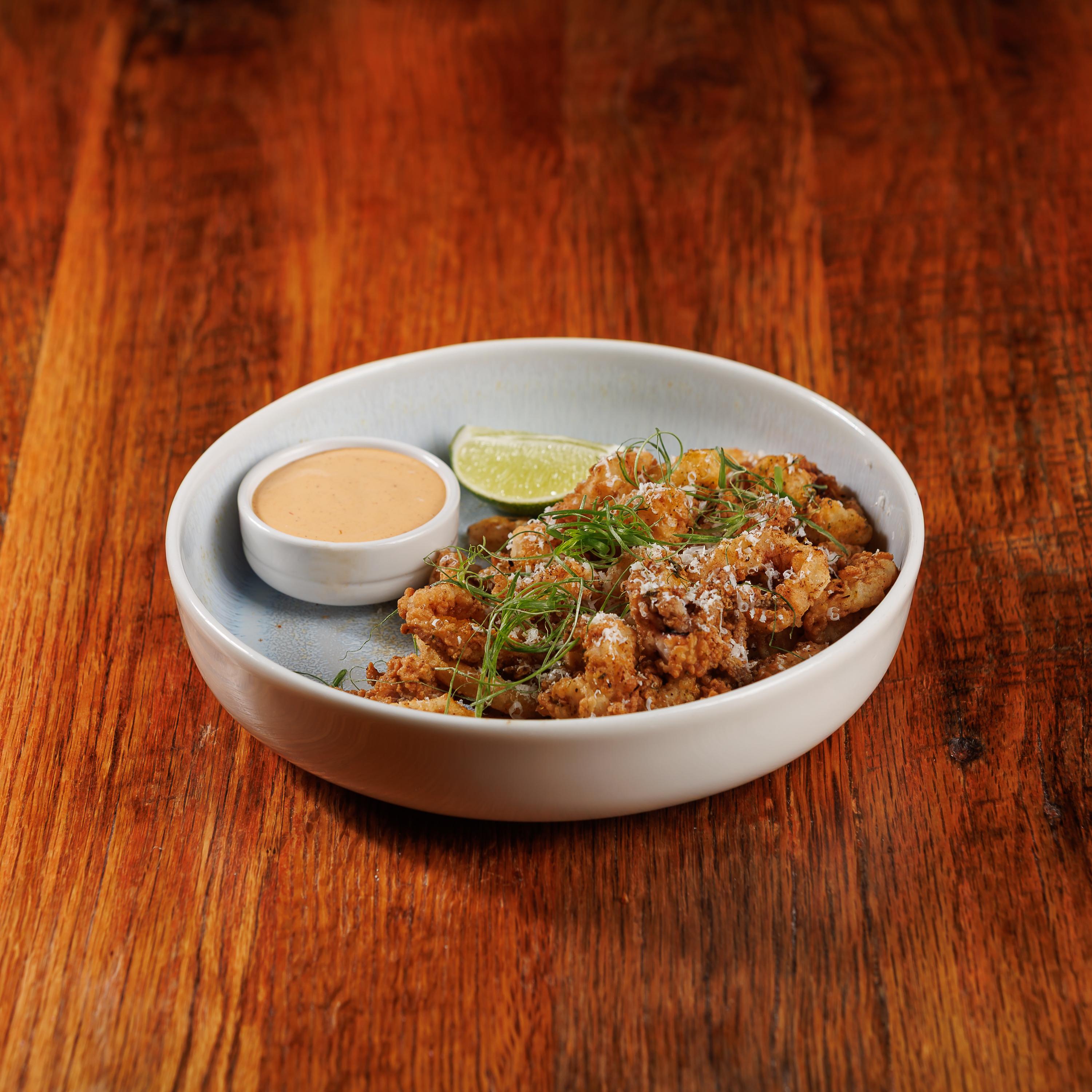 salt and pepper calamari, smoked sofrito crema, pickled peppers