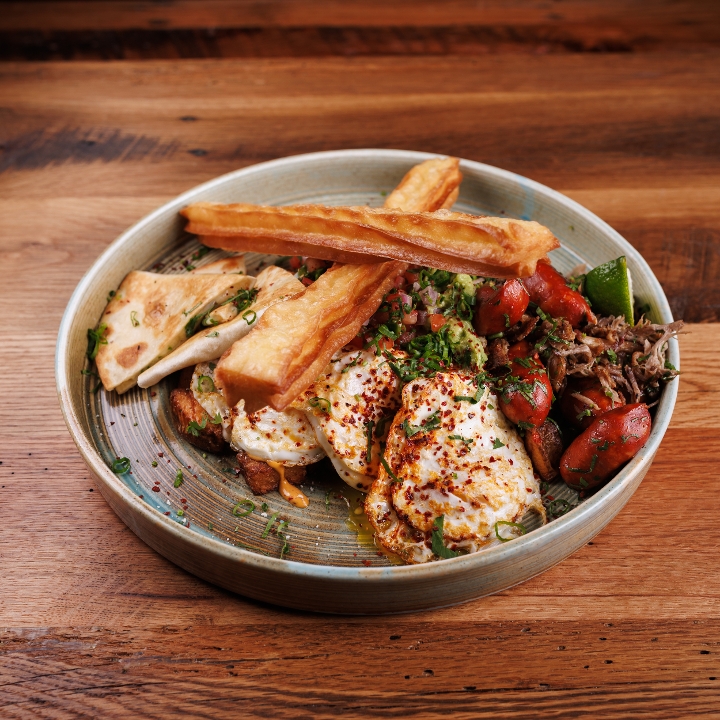 three fried eggs, mini chorizo, pork carnitas, cheese quesadilla, guacamole, sofrito home fries, breakfast churros