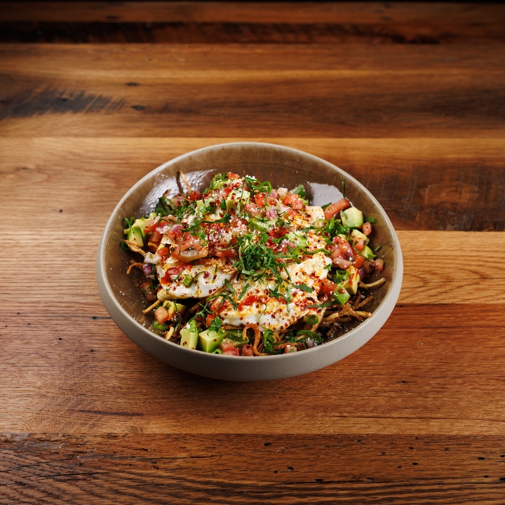 cholula fried eggs, shoe string fries, queso cotija, pico de gallo, avocado, chipotle torta sauce