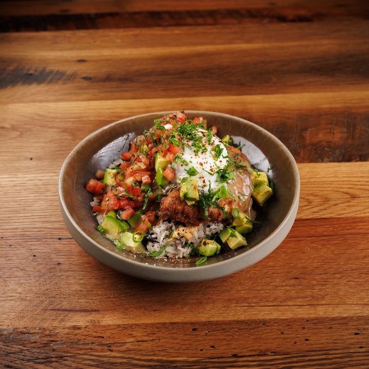 ancho fried chicken, chimichurri rice & beans, jalapeño gravy, avocado, poached egg