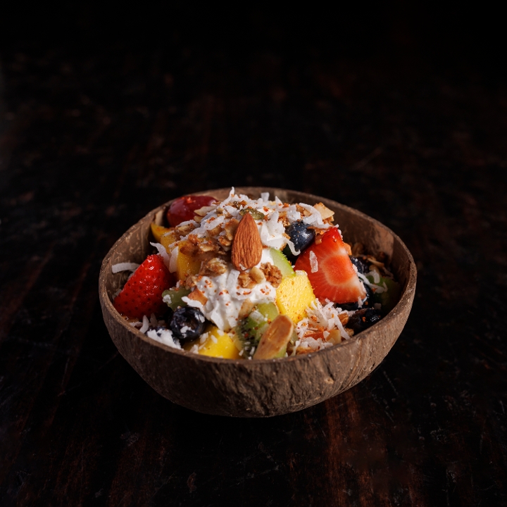 agave lime syrup, fruit cocktail, almond granola, coconut yogurt