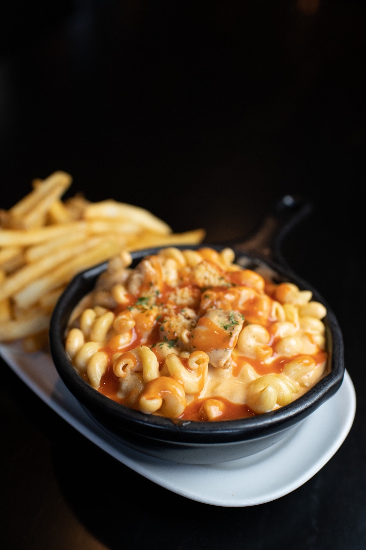 rich & creamy four cheese sauce, buffalo chicken, buttery panko parmesan topping