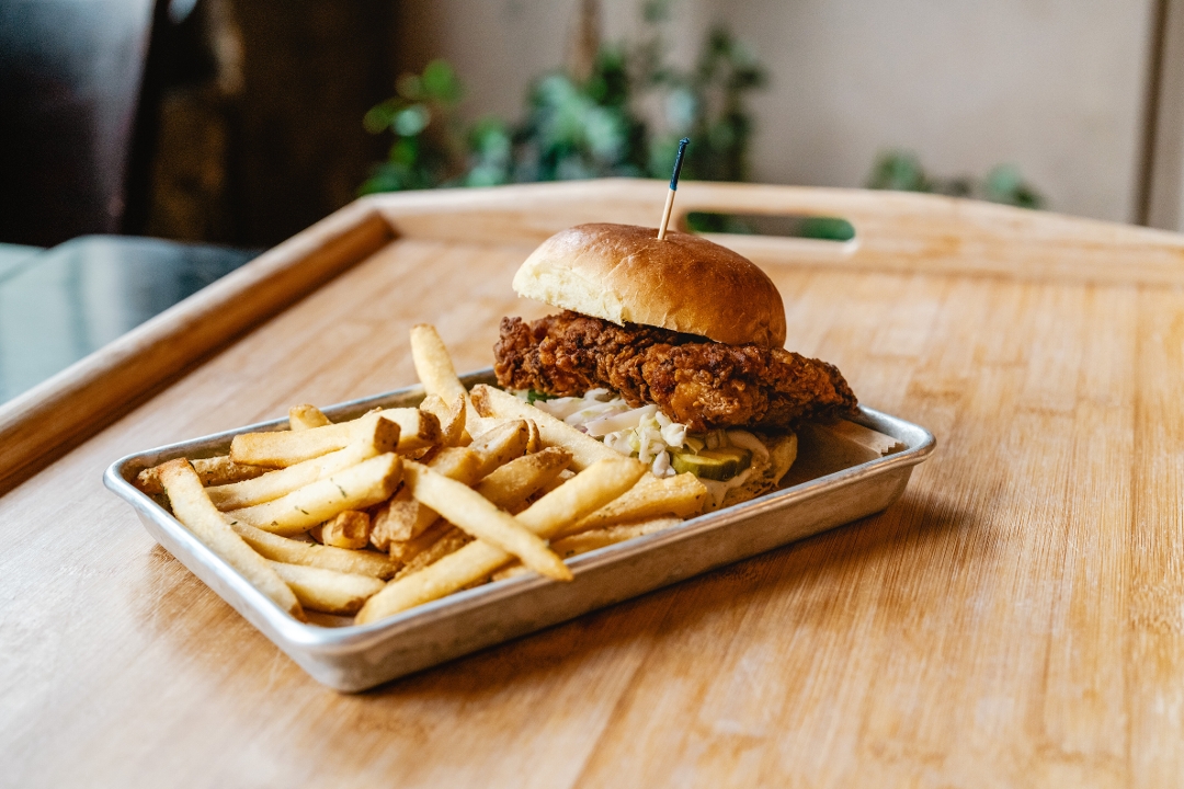 buttermilk fried chicken thigh topped with sliced pickles, jalapeño cider slaw & dill pickle aioli on a toasted bun