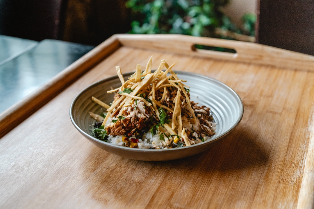 steamed rice, roasted corn & black bean salsa, chili lime crema, cotija cheese, crispy tortilla strips & cilantro