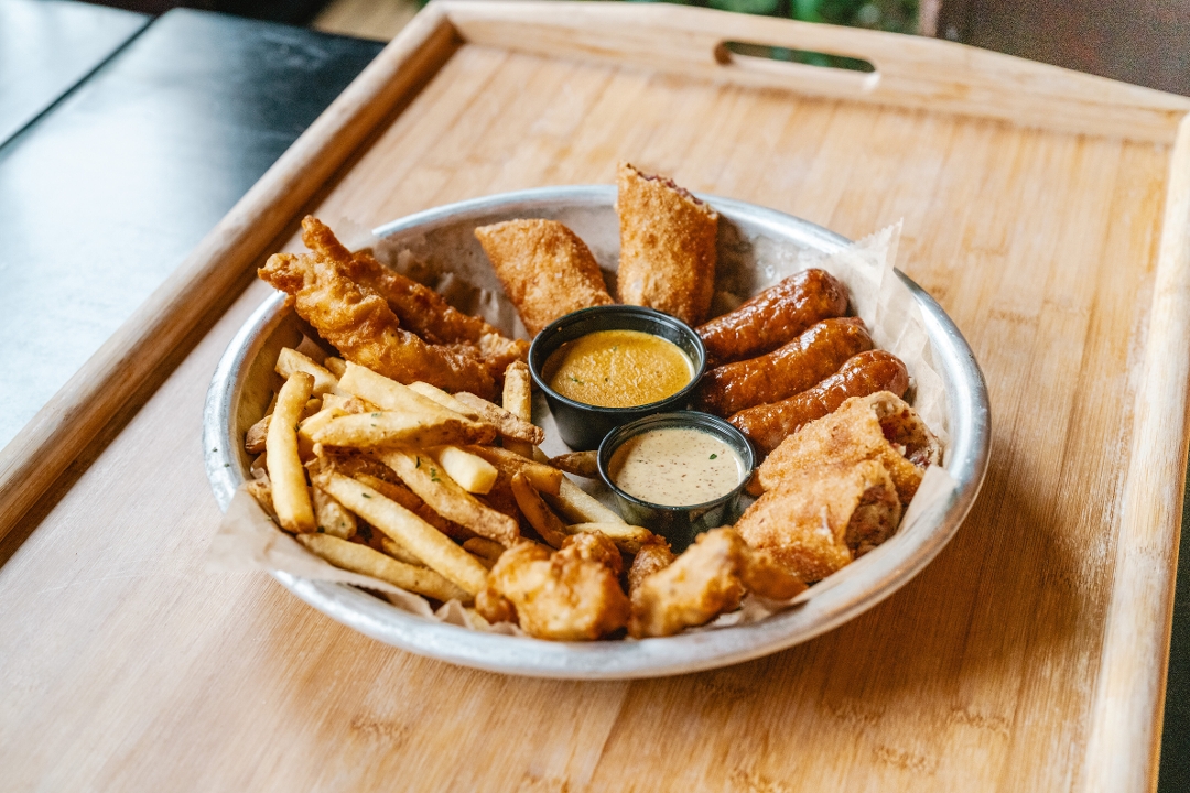 beer battered chicken tenders, irish sausages, curry chips, corned beef & cabbage egg rolls, served with guinness mustard