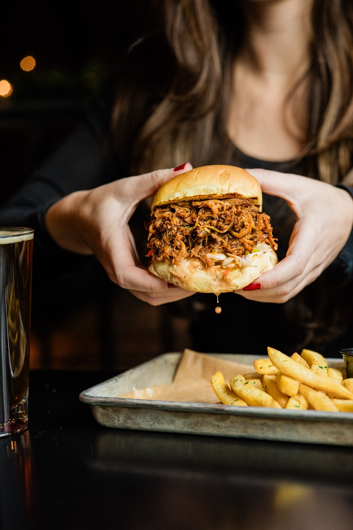 sweet & smoky bbq pulled pork, spicy cider slaw, dill pickles & ranch dressing on a toasted bun