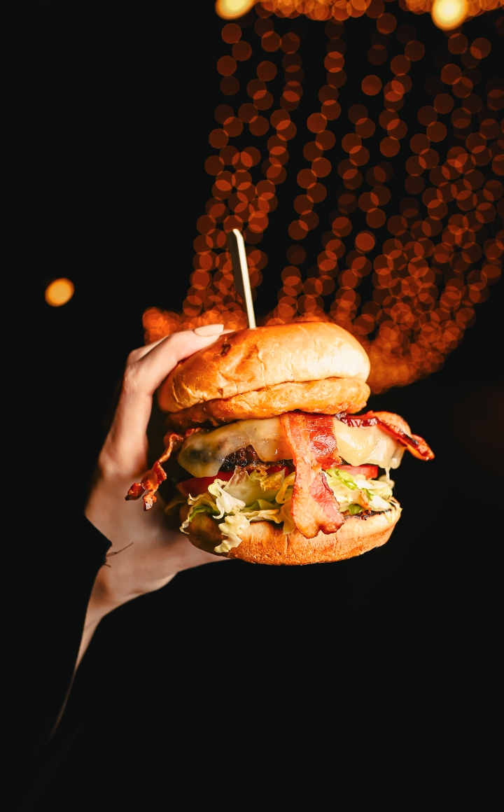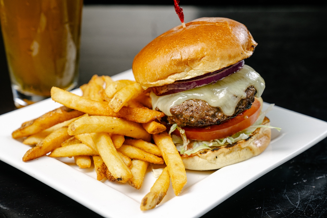 topped with bacon, vermont cheddar cheese, a crispy onion ring, bbq sauce, lettuce & tomato on a toasted bun
