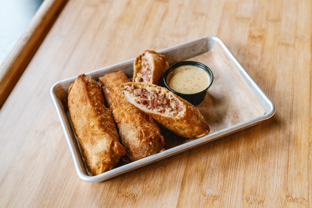 tender braised corned beef, cabbage & swiss cheese in crispy egg rolls, served with guinness mustard