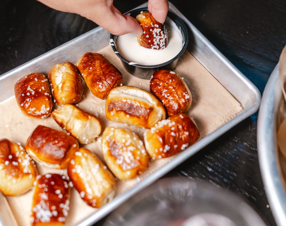 warm, soft, buttery & salted, served with creamy cheddar cheese dip