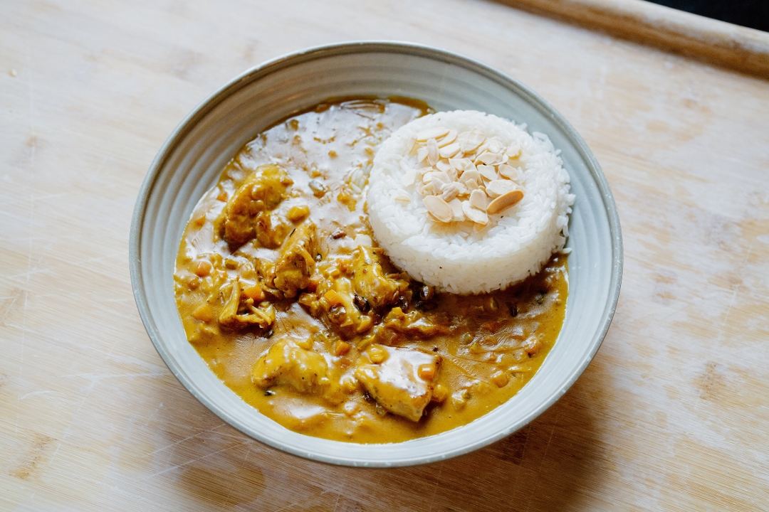 signature spicy coconut curry sauce with grilled chicken breast, slivered almonds & golden raisins, served over white rice