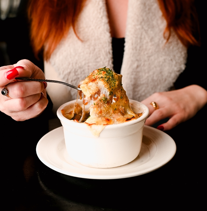better than french onion because guinness is good for you, topped with an herb crouton, swiss & white cheddar cheese