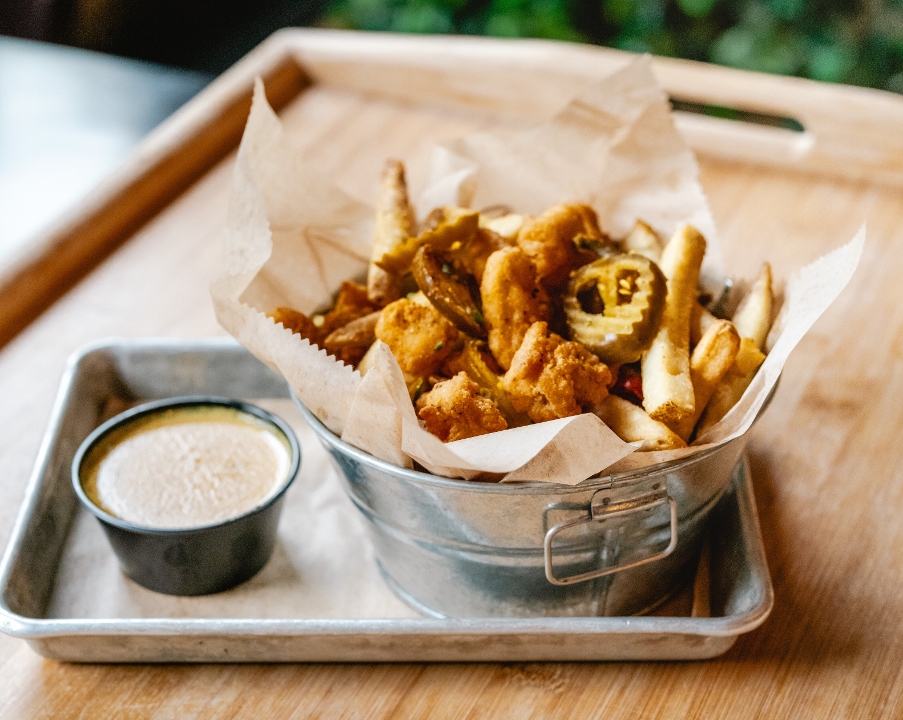 fried chicken bites, house fries, green onions & hot cherry peppers, tossed with toasted sesame & five spice mix, served with curry sauce