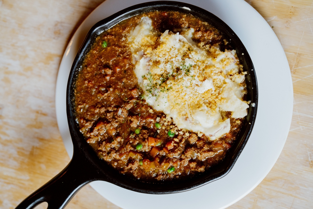 slow braised beef, carrots, peas & whipped potatoes, topped with toasted parmesan herb crumbs