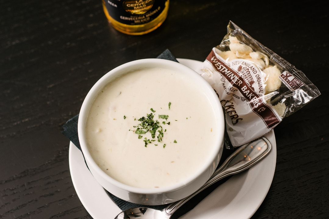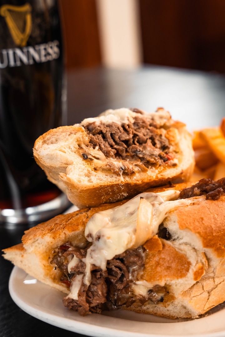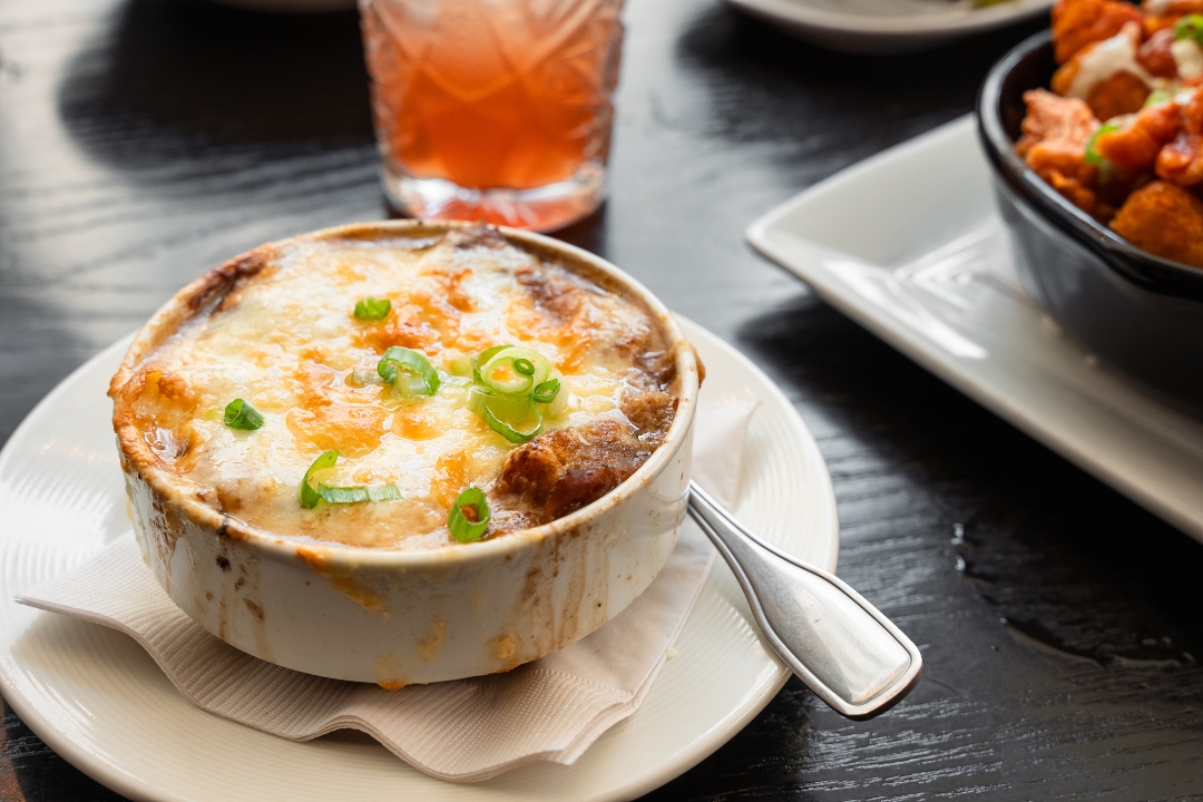 better than french onion soup because “guinness is good for you,” topped with herbed croutons, melted white cheddar & swiss cheese, served in a crock