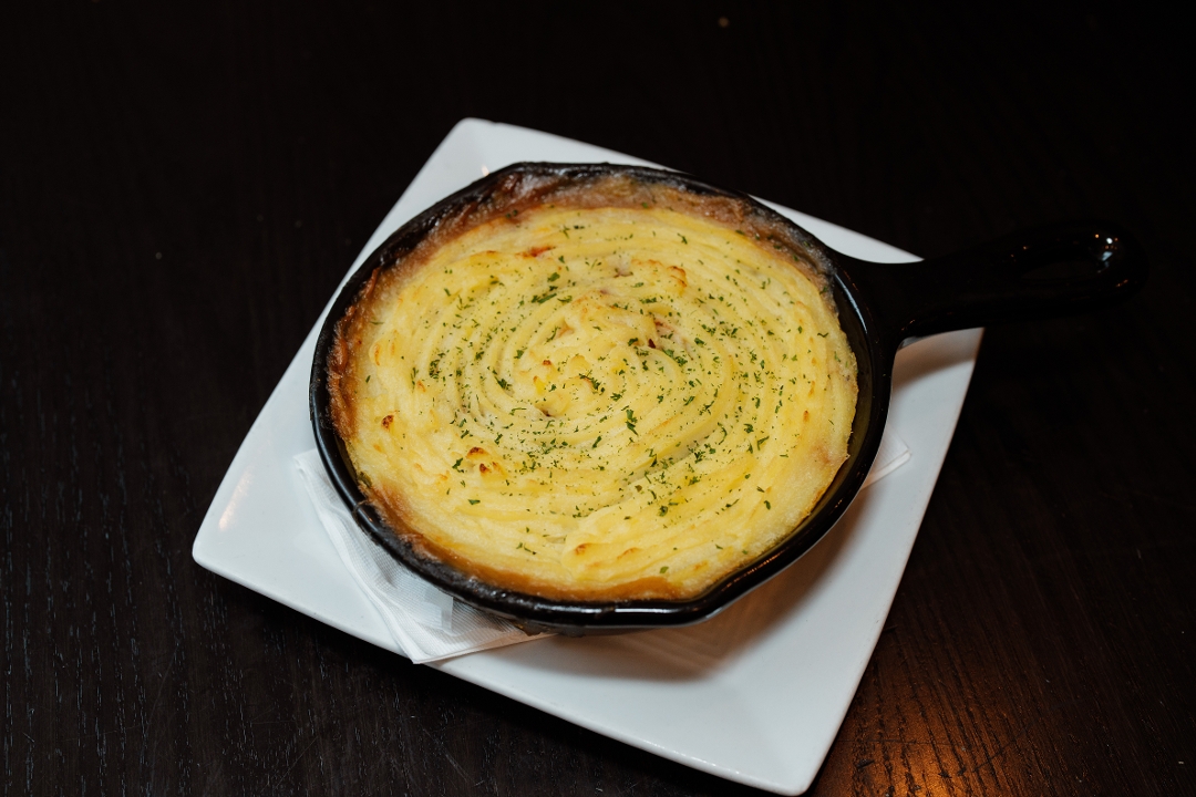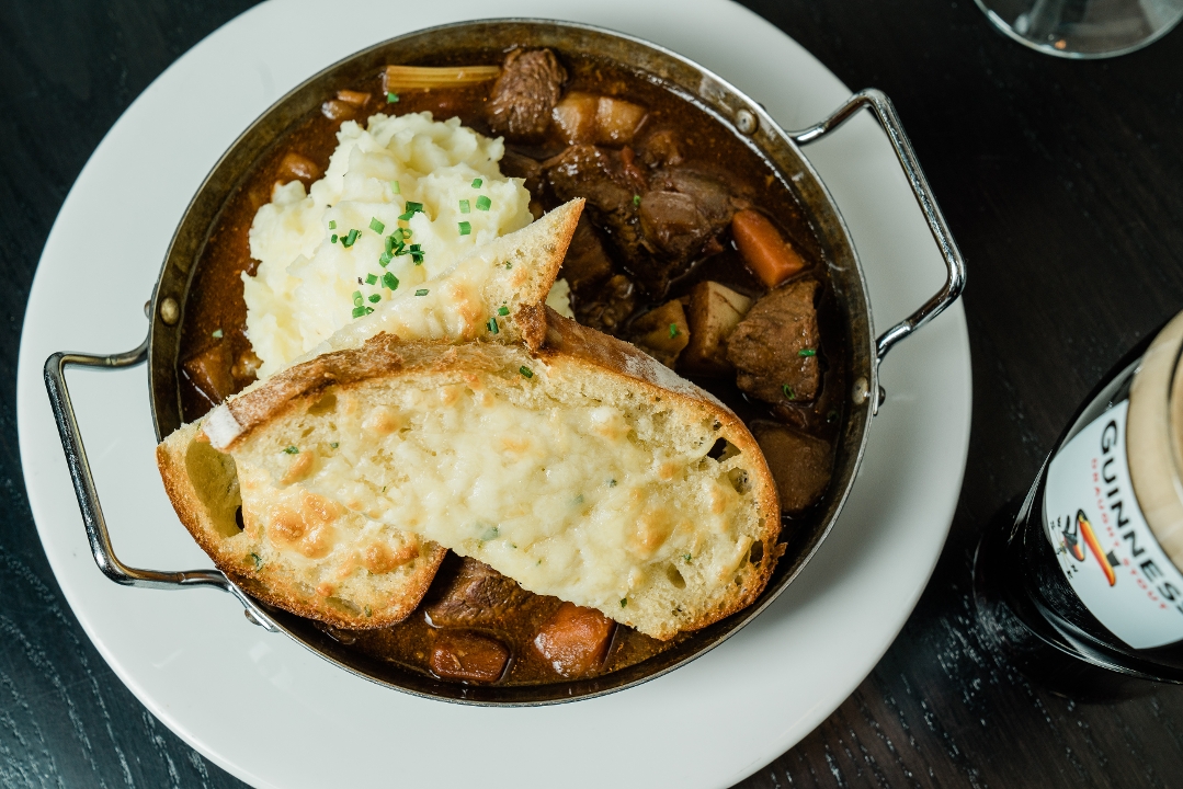 slow-braised beef, roasted root vegetables & fresh thyme, in a rich stout reduction, with mashed potatoes & garlic bread