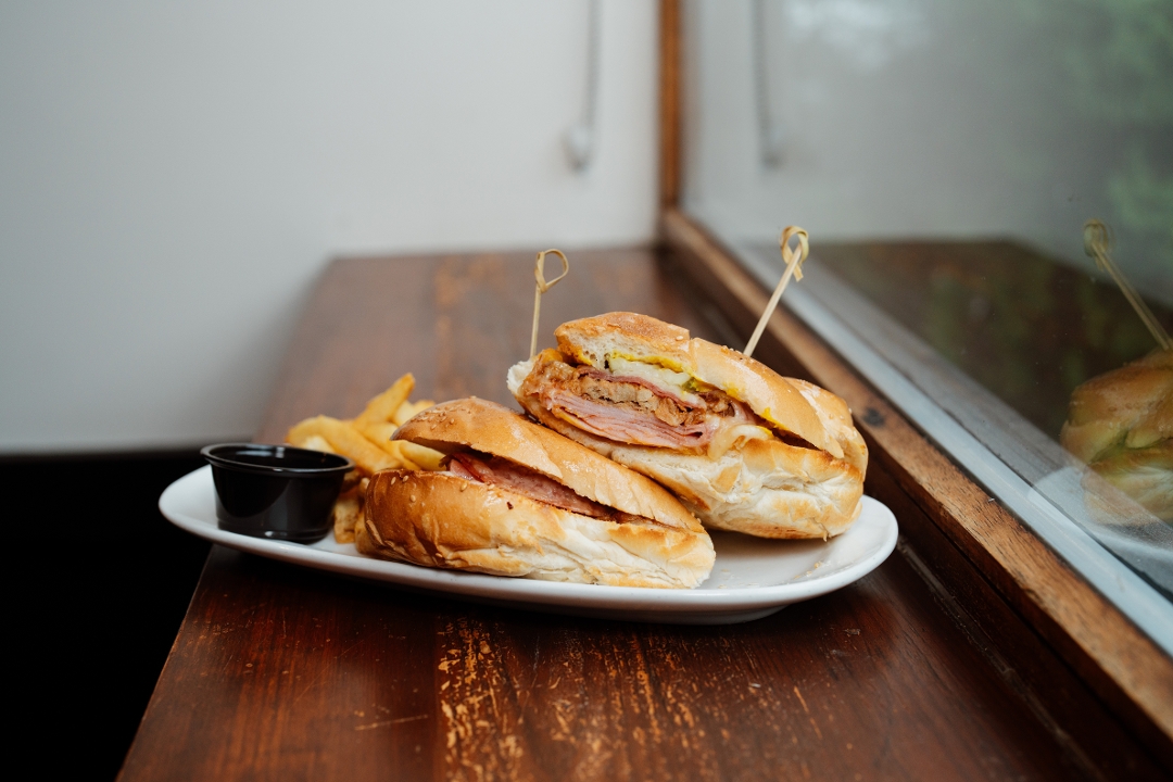 slow roasted bbq pulled pork, smoked ham, salami, pickles, swiss cheese & yellow mustard on a sesame seed braided roll