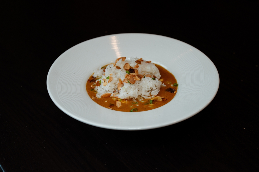 curry sauce, sautéed chicken breast, onions, celery & carrots, coconut jasmine rice, toasted almonds & golden raisins