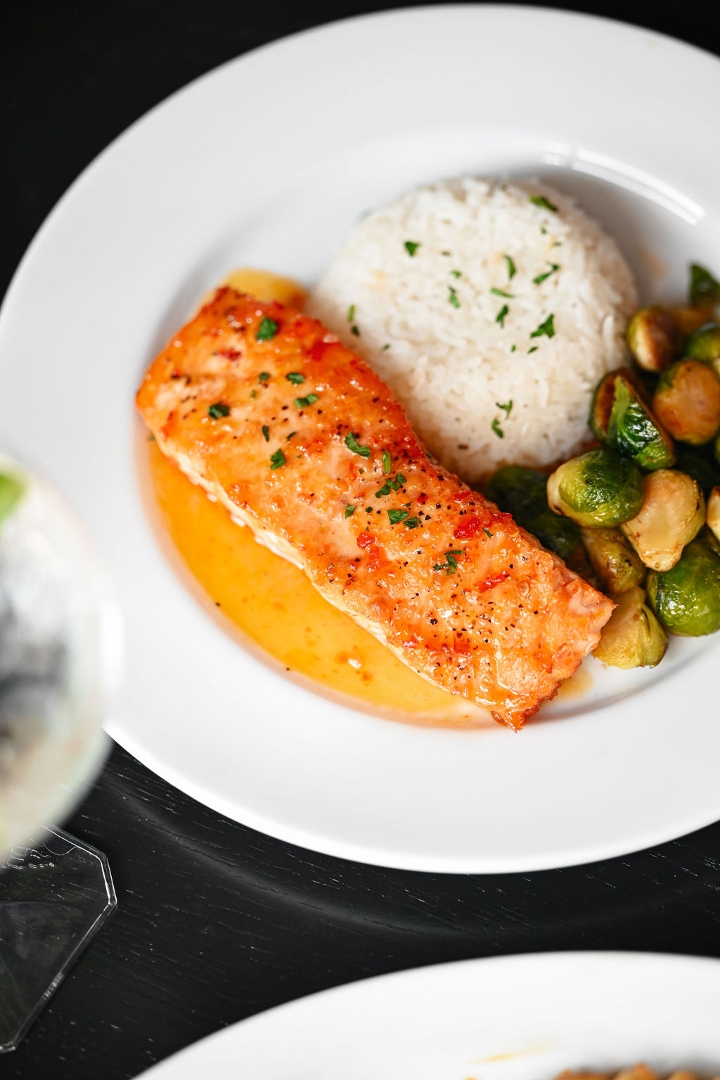 sweet & spicy chili glaze, coconut jasmine rice & seasonal vegetables