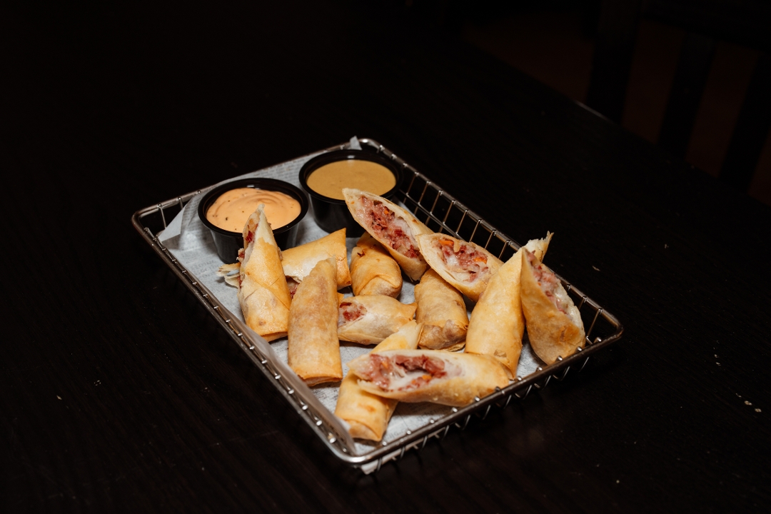 braised corned beef, cabbage & swiss cheese wrapped in a crispy egg roll served with guinness dijon mustard & thousand island dipping sauce